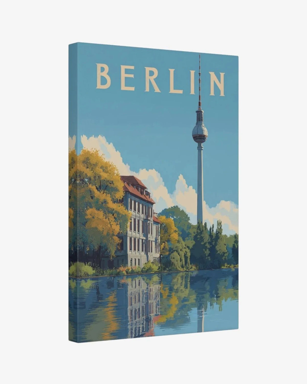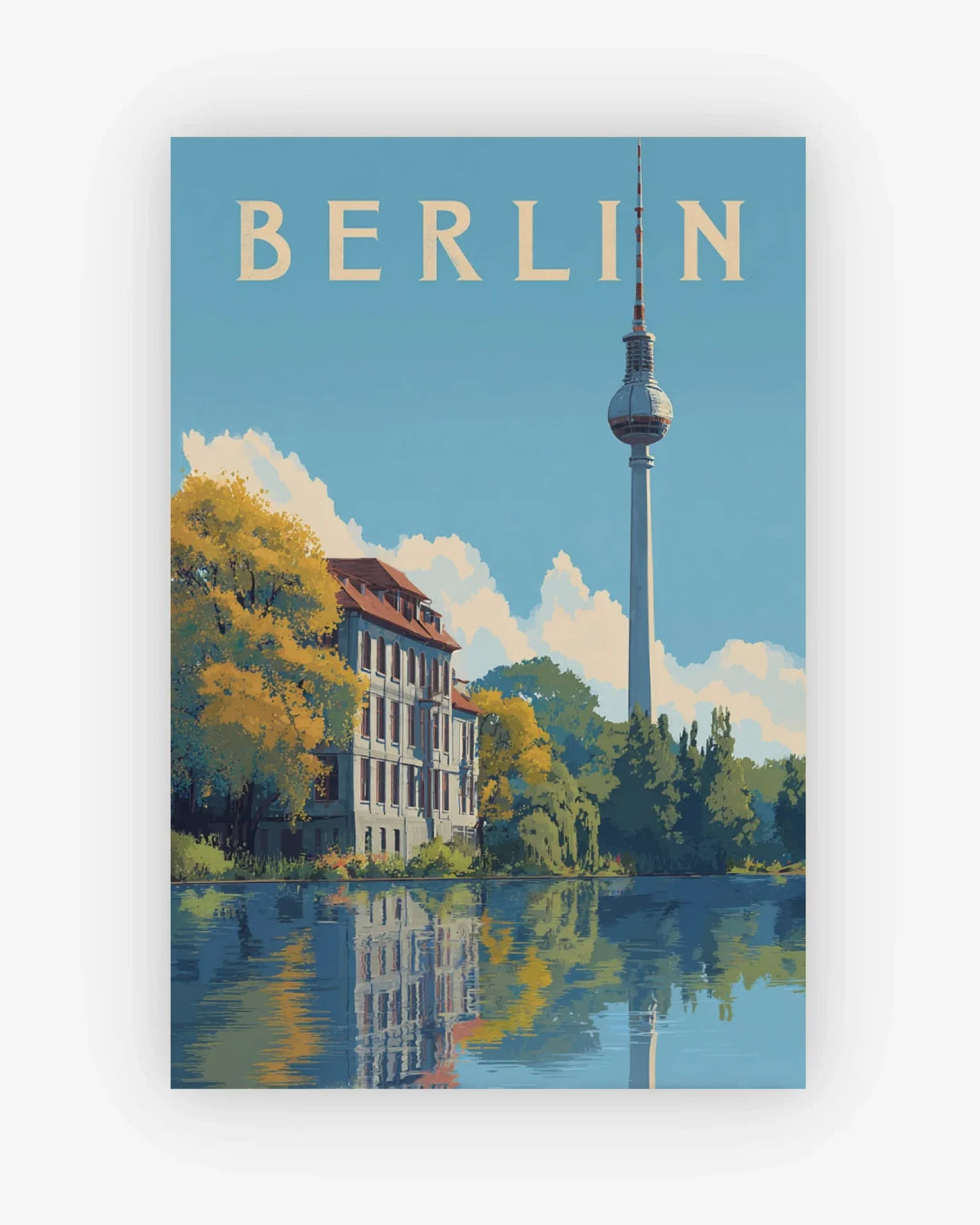Capture the historic elegance of Berlin with this tranquil riverside scene. The famous Fernsehturm rises into a soft blue sky, reflected perfectly in the Spree River alongside lush greenery and classic architecture. This print offers a serene and balanced view of the city, blending its monumental history with a peaceful, modern-day atmosphere.