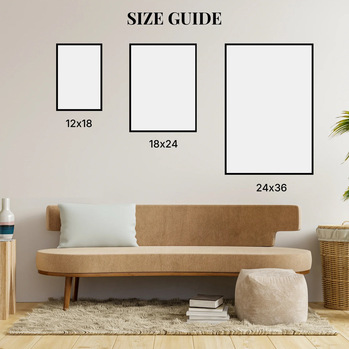 • Frame options: black, white, or dark wood