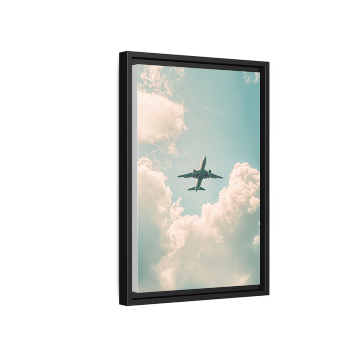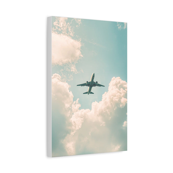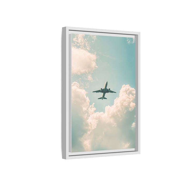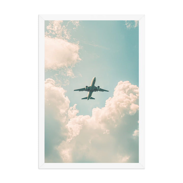 The Above the Clouds print captures a moment of ascent — a lone plane rising through soft clouds against an off-white sky, rendered in warm, vintage tones. Its minimal composition and nostalgic palette evoke the timeless spirit of travel, calm, and quiet wonder.