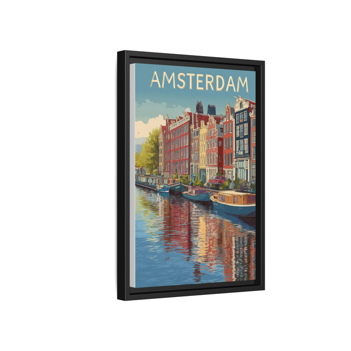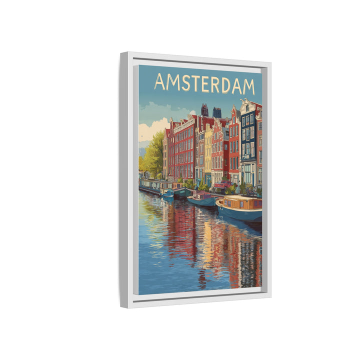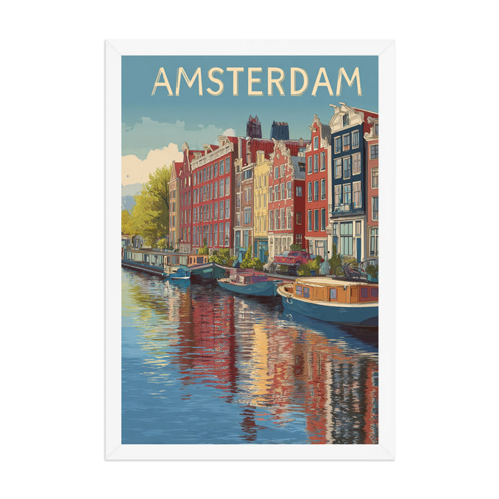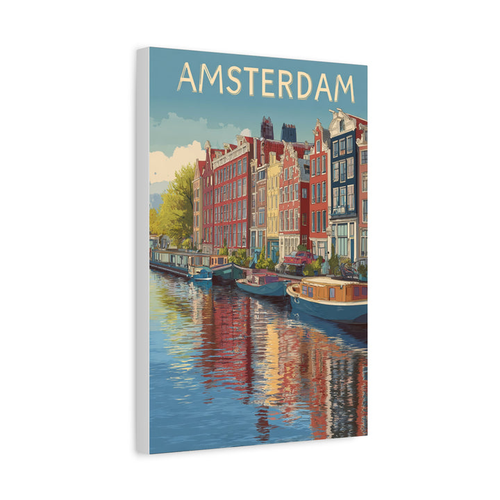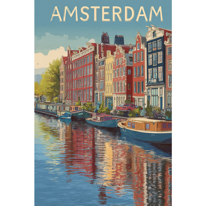 The Amsterdam piece captures the charm of the city’s canals — mirrored waters reflecting rows of painted façades beneath soft daylight. Gentle tones of red, gold, and blue create a rhythm of stillness and movement, echoing the quiet poetry of daily life by the water.