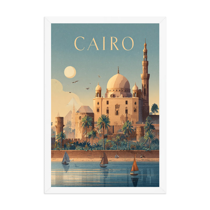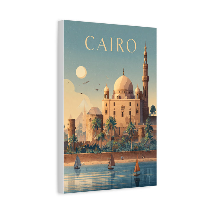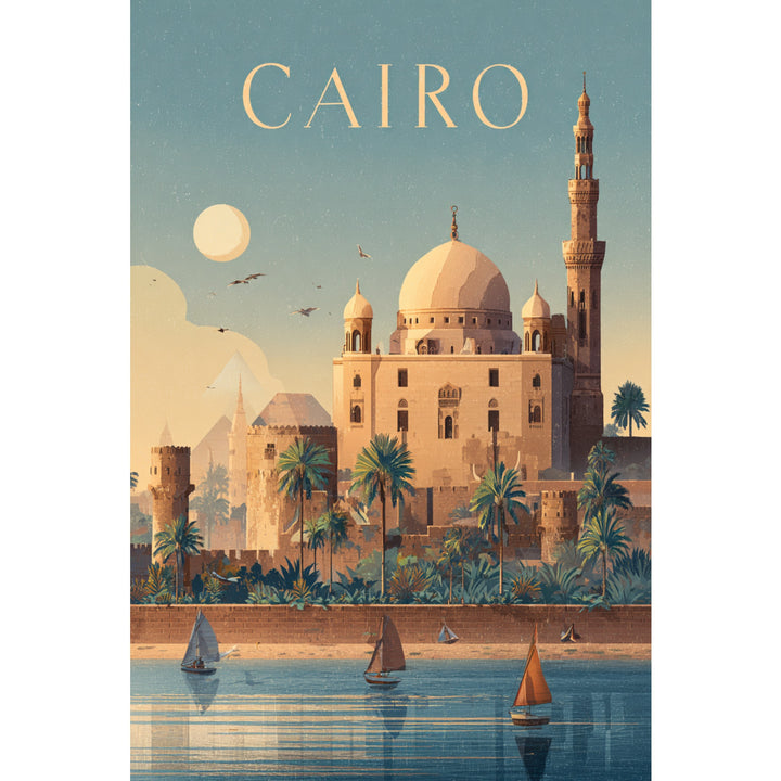 The Cairo piece captures the golden glow of Egypt’s capital — domes, minarets, and palms rising beside the Nile beneath a soft desert sky. Subtle sand and teal hues convey warmth, depth, and tranquility, blending ancient heritage with serene modern design.