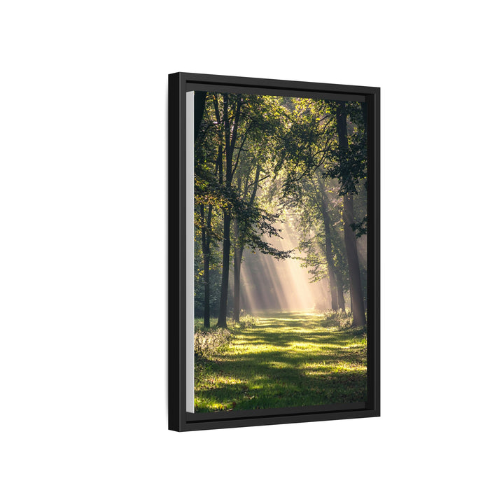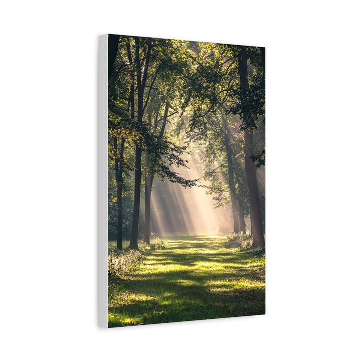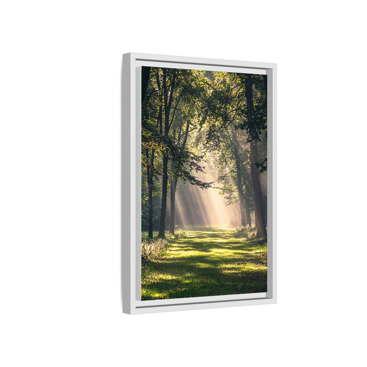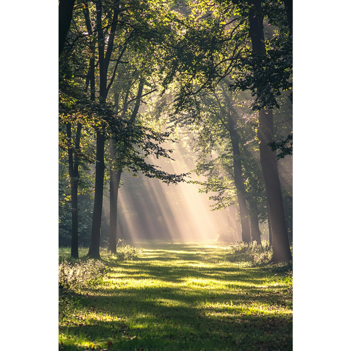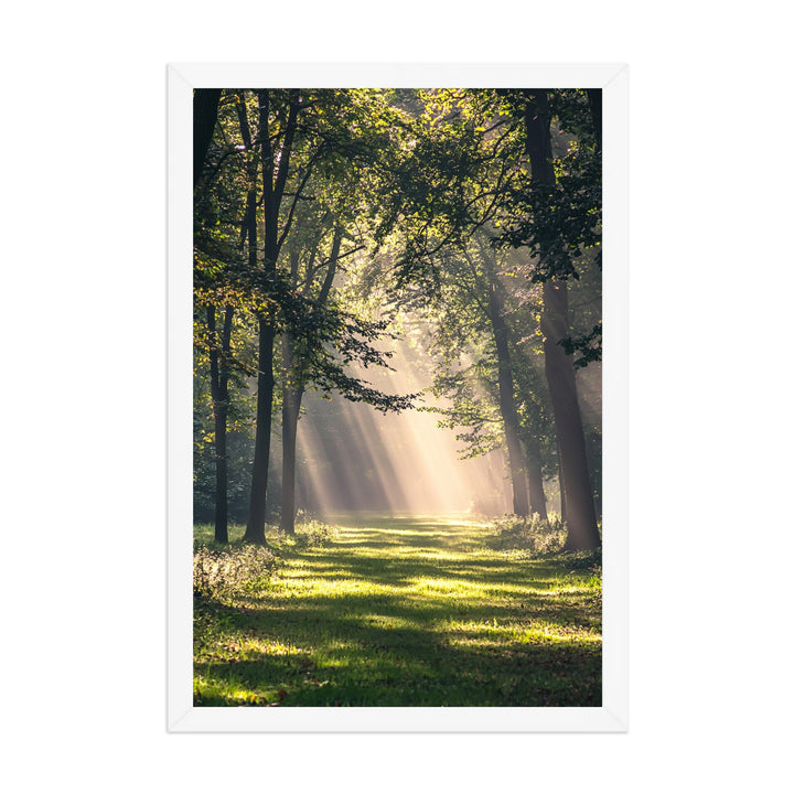 Forest Light captures sunlight streaming through quiet woodland — golden rays piercing the canopy and painting the forest floor in warmth. The composition radiates calm energy, celebrating the balance between light, air, and living form.