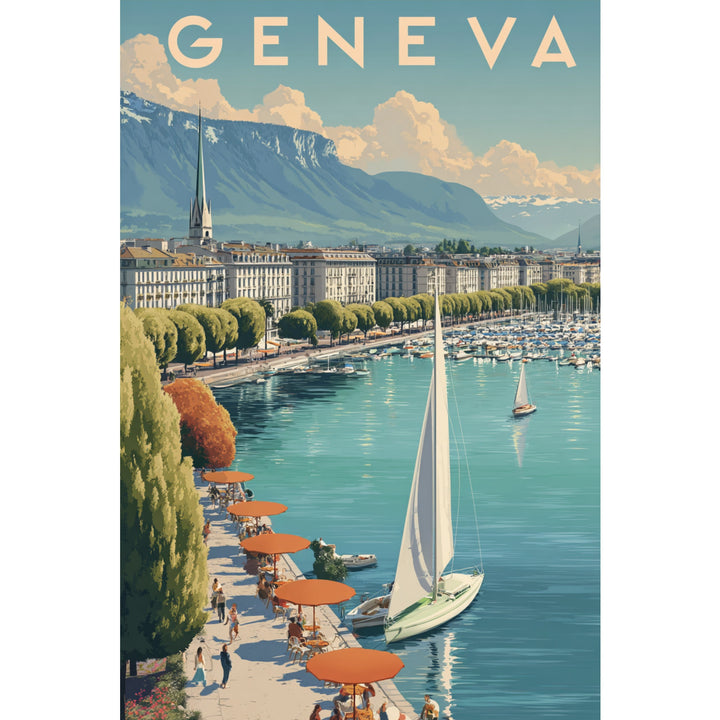 The Geneva piece captures the sophistication of the Swiss lakeside — sailboats drifting beneath alpine peaks, sunlit terraces lining the water’s edge. Gentle tones of teal, cream, and gold bring to life the city’s harmony of nature, architecture, and ease.