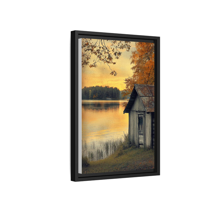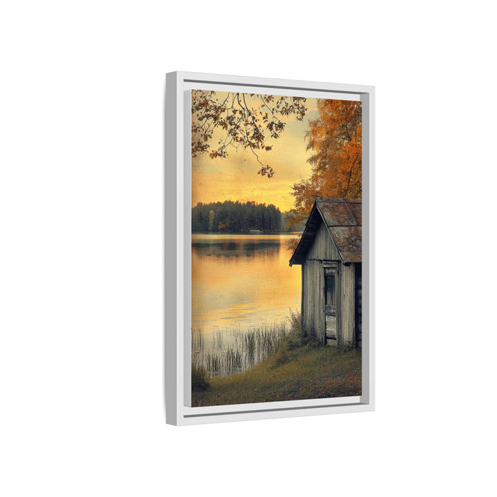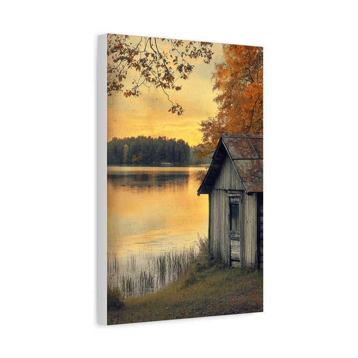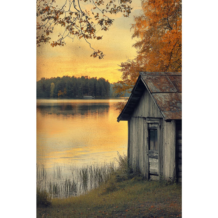 The Golden Retreat print captures a quiet cabin by a tranquil lake, bathed in the golden glow of sunset. Autumn leaves frame the reflection on calm waters, while the weathered wood and soft vintage texture evoke nostalgia, warmth, and the beauty of slowing down.