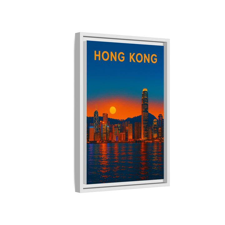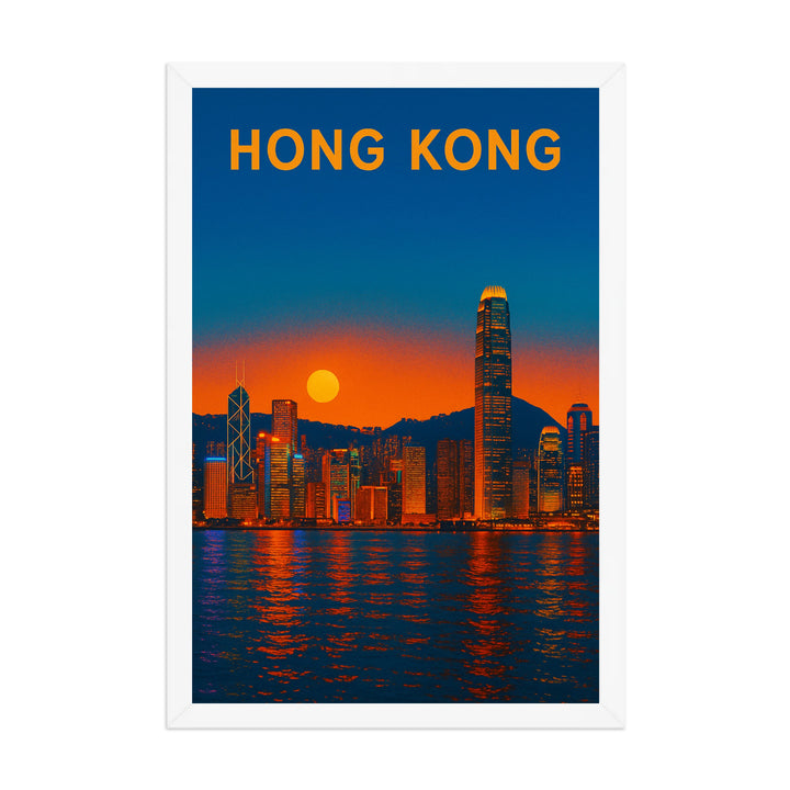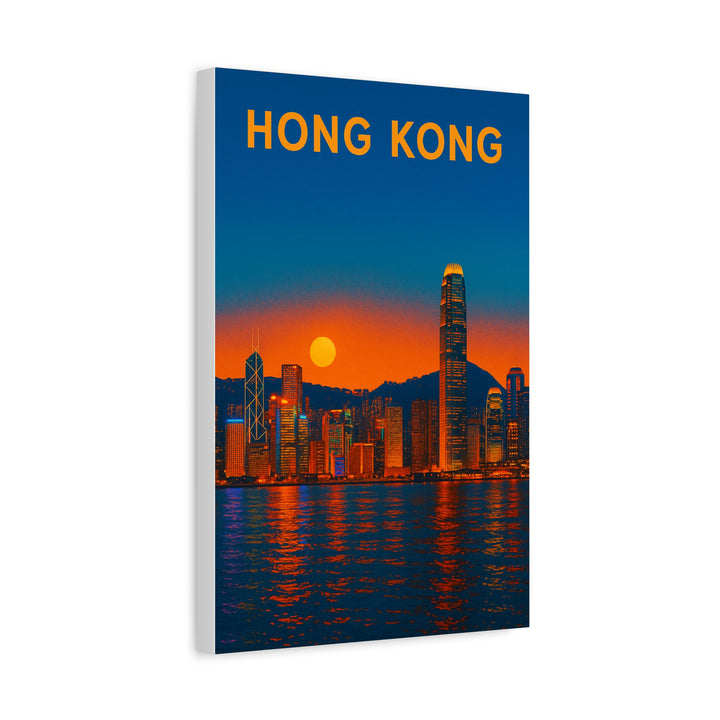 The Hong Kong piece captures the city at dusk — glowing towers mirrored on the harbor as the sun sets behind Victoria Peak. Rich amber and indigo tones create a sense of energy and calm all at once, blending modern architecture with the rhythm of the sea.