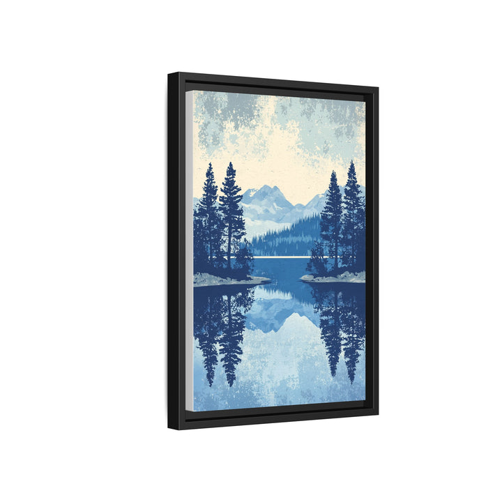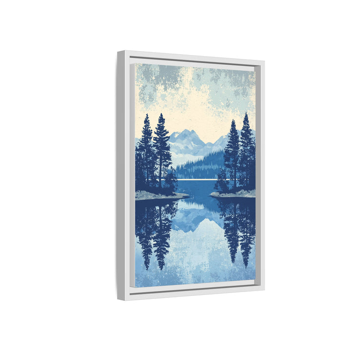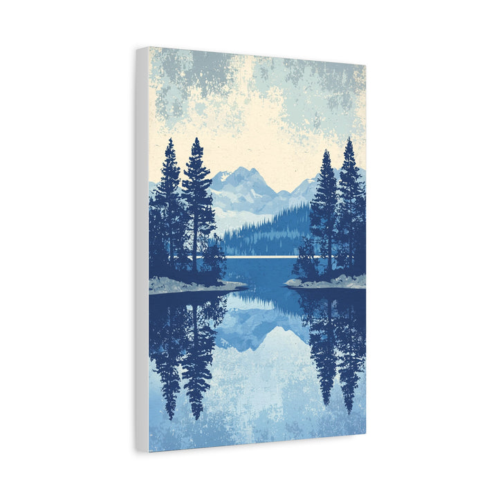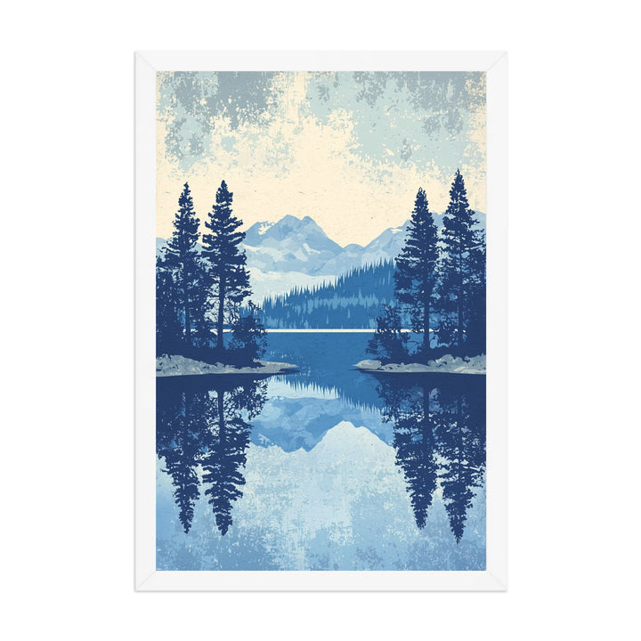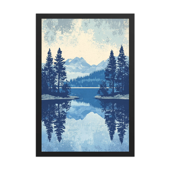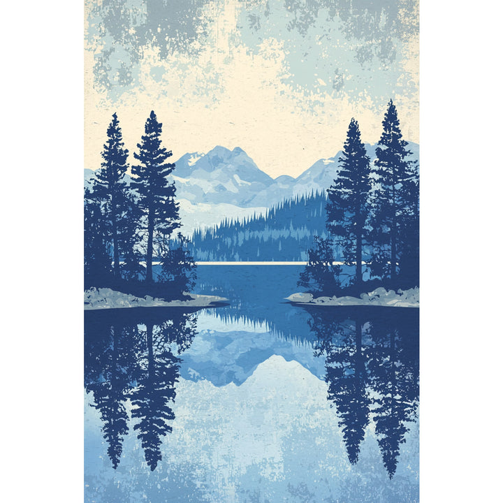 The Lake Tahoe Reflections print captures the calm majesty of Lake Tahoe through the lens of vintage design — pine silhouettes, mirrored horizons, and a cool blue palette that evokes clarity and quiet. Its flat vector landscape and retro texture blend mid-century simplicity with natural serenity, making it both timeless and contemporary.