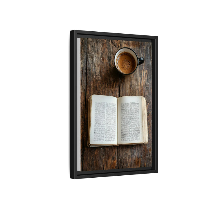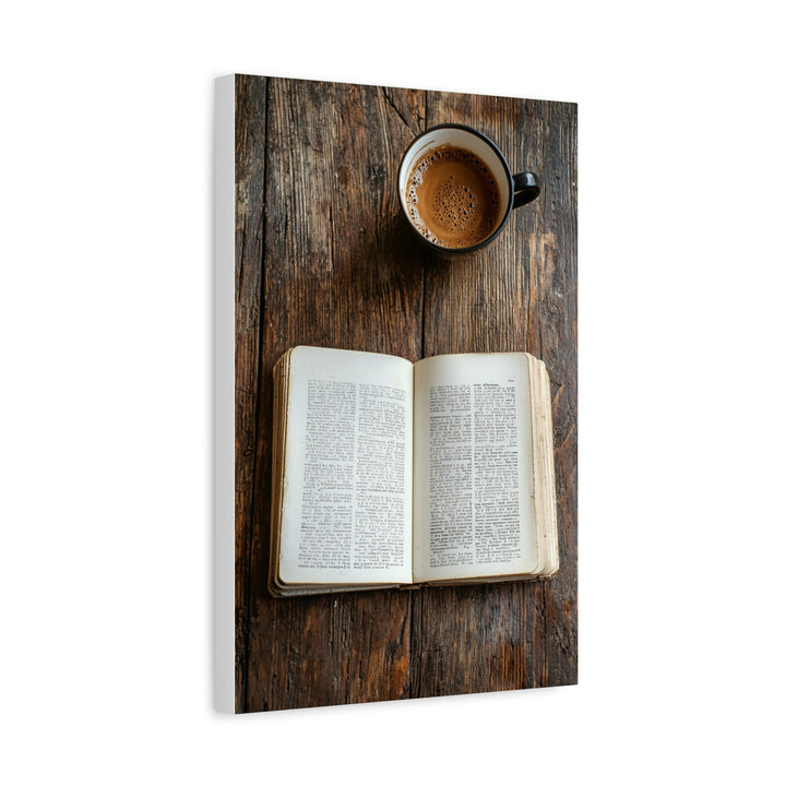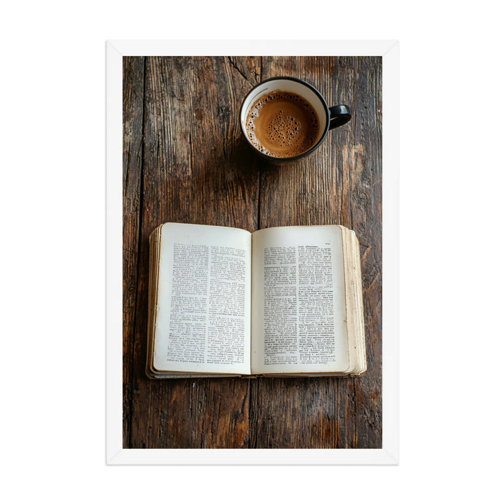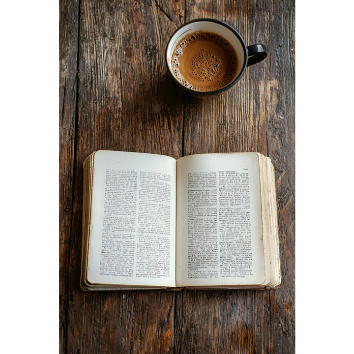 The Morning Pages print captures a quiet, grounding moment — an open journal resting on a rustic wooden table beside a cup of freshly brewed coffee. Bathed in warm tones and softened by vintage film grain, it embodies the calm rhythm of slow mornings and creative thought.