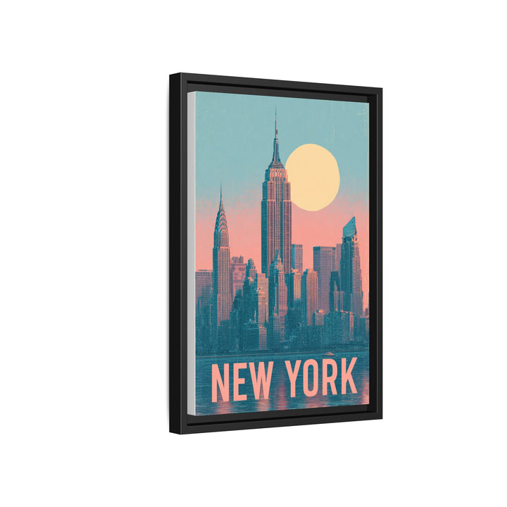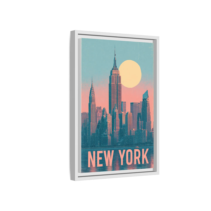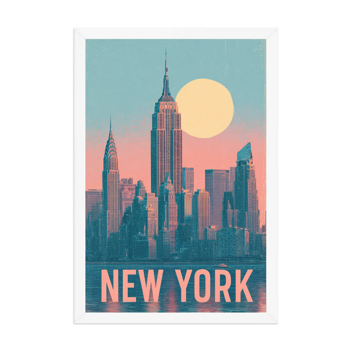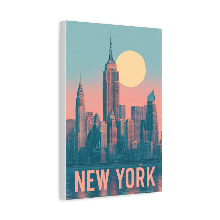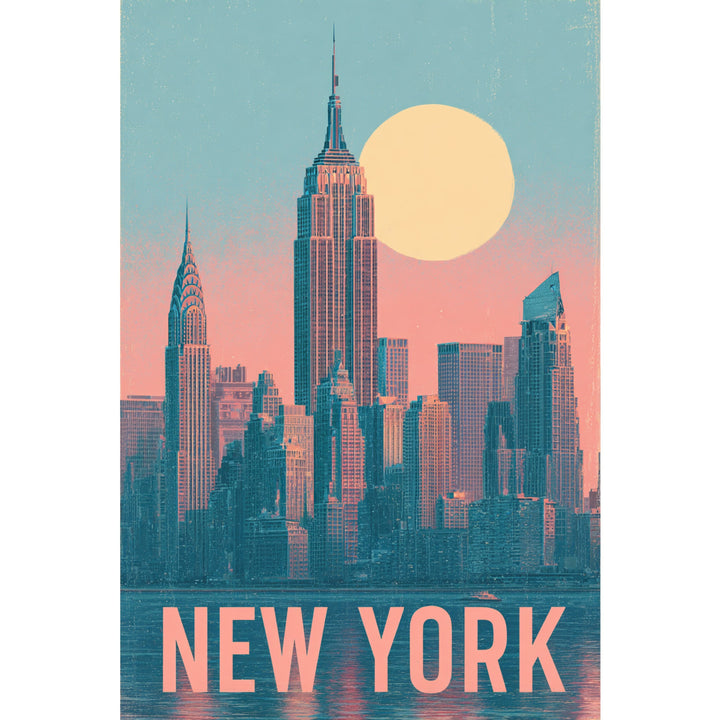 The New York piece captures the architectural rhythm of the city that never sleeps — the Empire State Building rising through soft pink light as the skyline reflects across calm waters. Hues of coral, steel blue, and ivory merge to express both the pulse and poise of urban life.