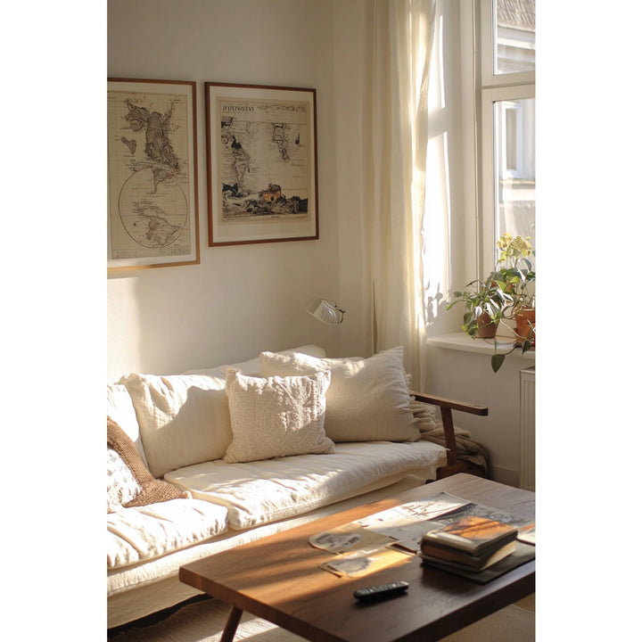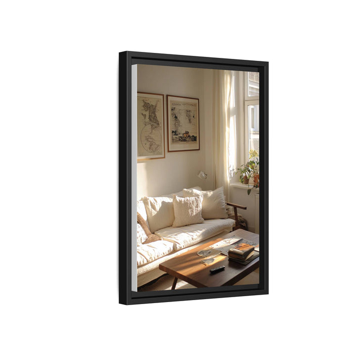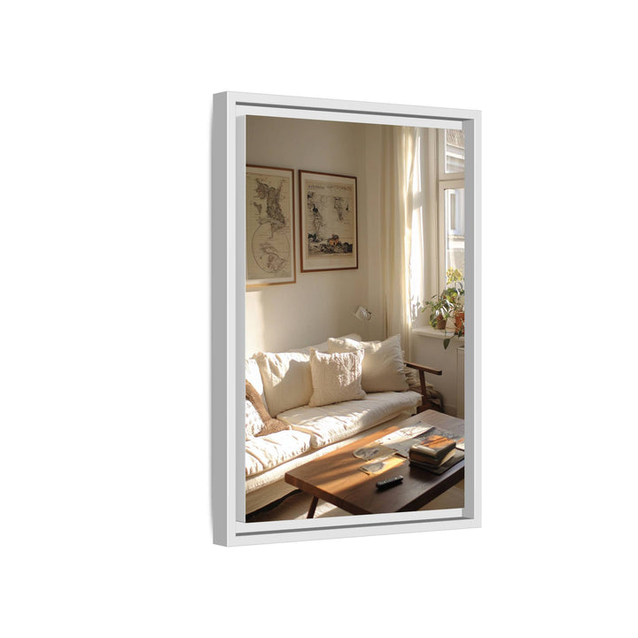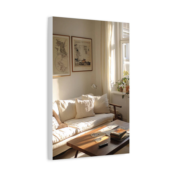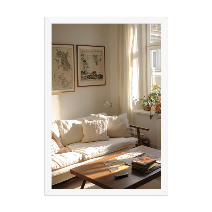 The Nordic Light print captures a sunlit Scandinavian living space — clean lines, neutral tones, and travel prints on the wall illuminated by soft afternoon light. Its calm composition and natural textures evoke a sense of serenity, balance, and timeless simplicity.