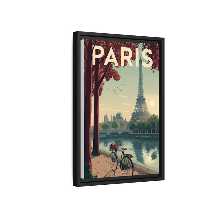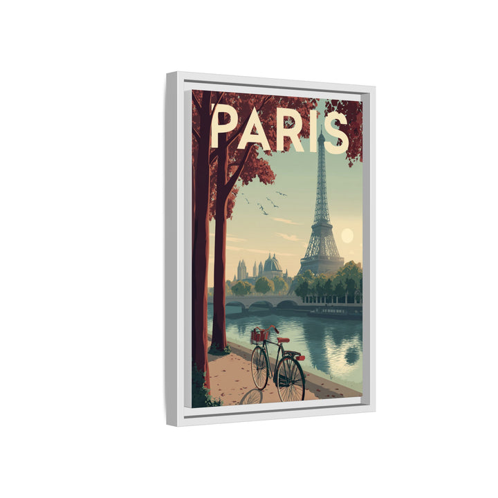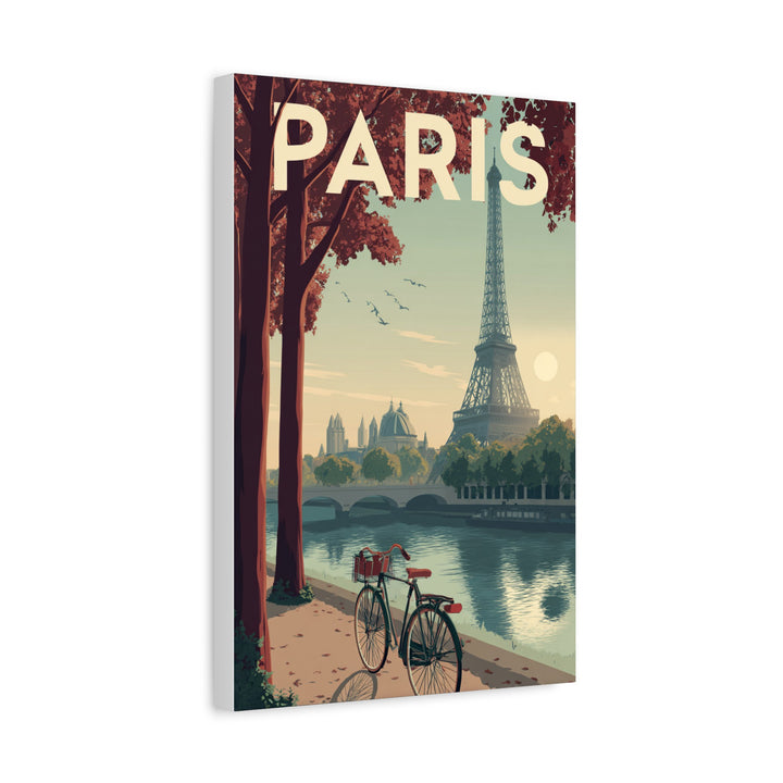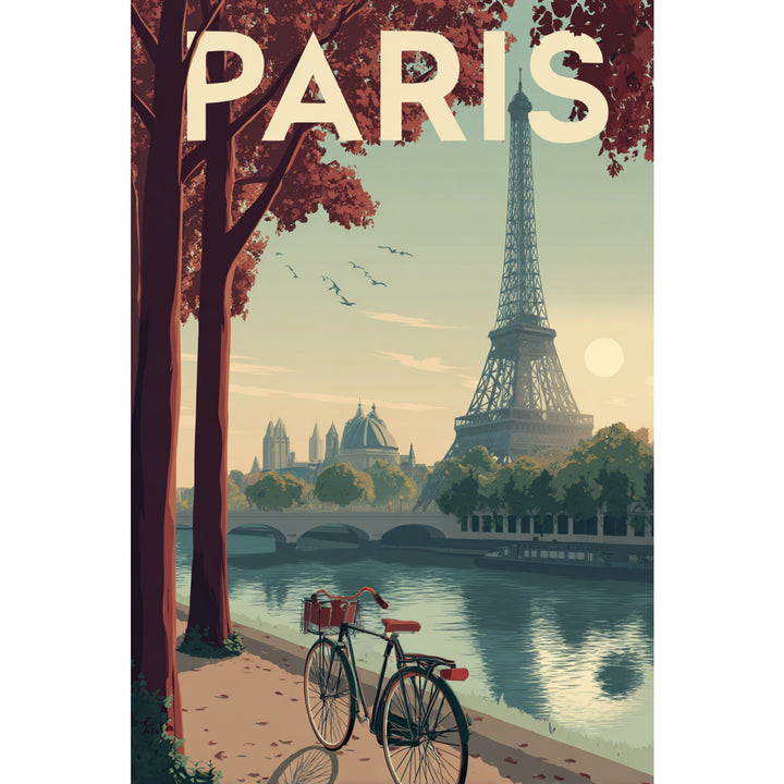 The Paris piece captures the quiet beauty of the city at golden hour — a bicycle rests along the Seine as the Eiffel Tower rises through soft afternoon light. Warm tones of rose, cream, and olive create a calm, cinematic balance, evoking nostalgia and effortless elegance.