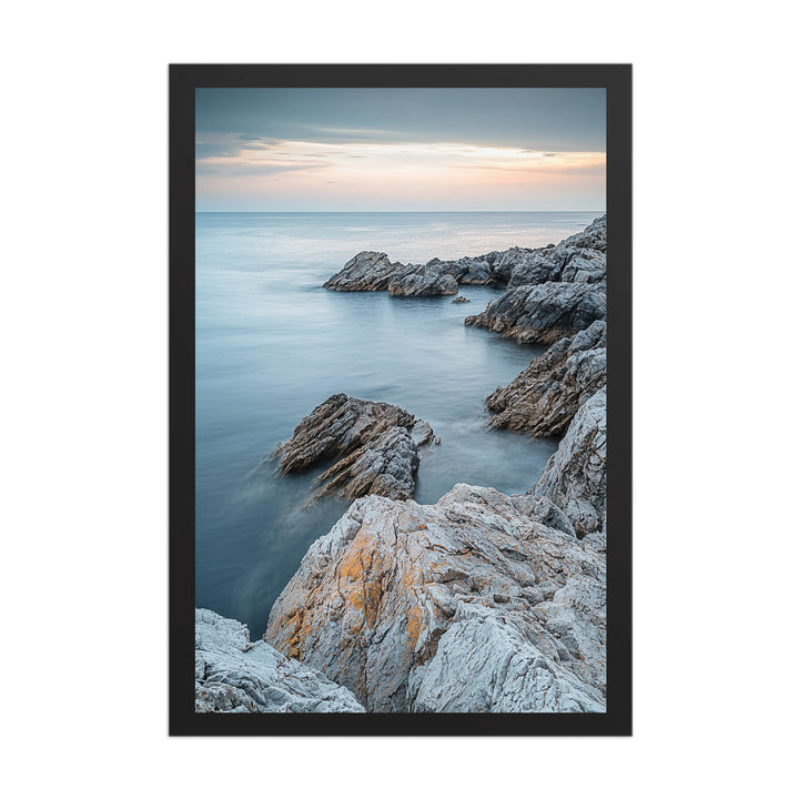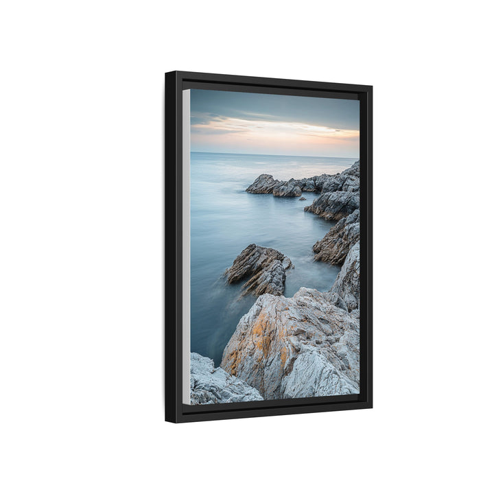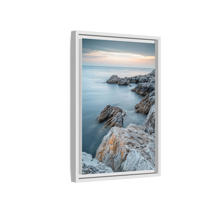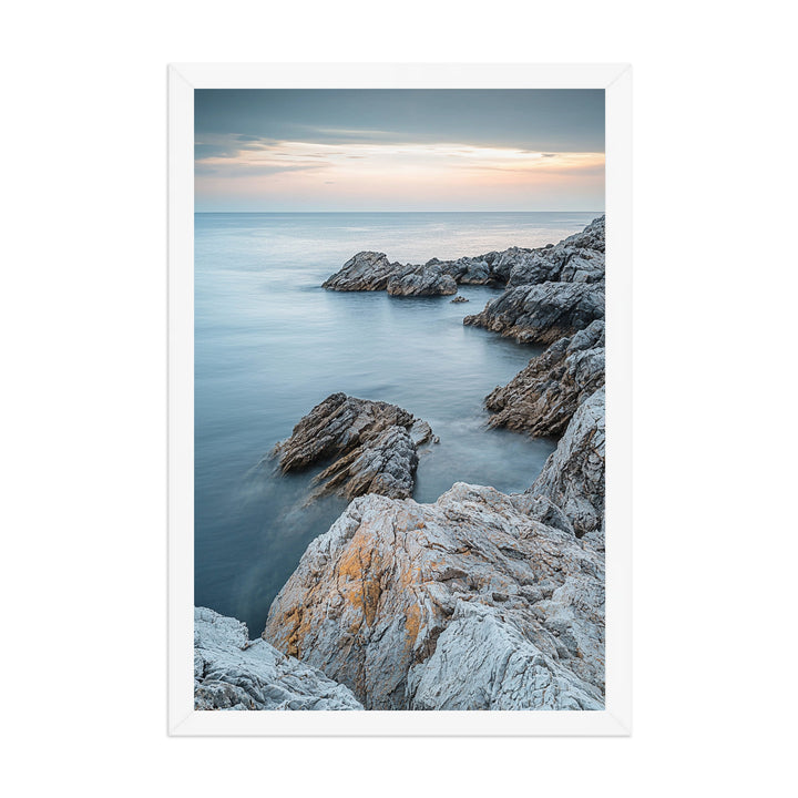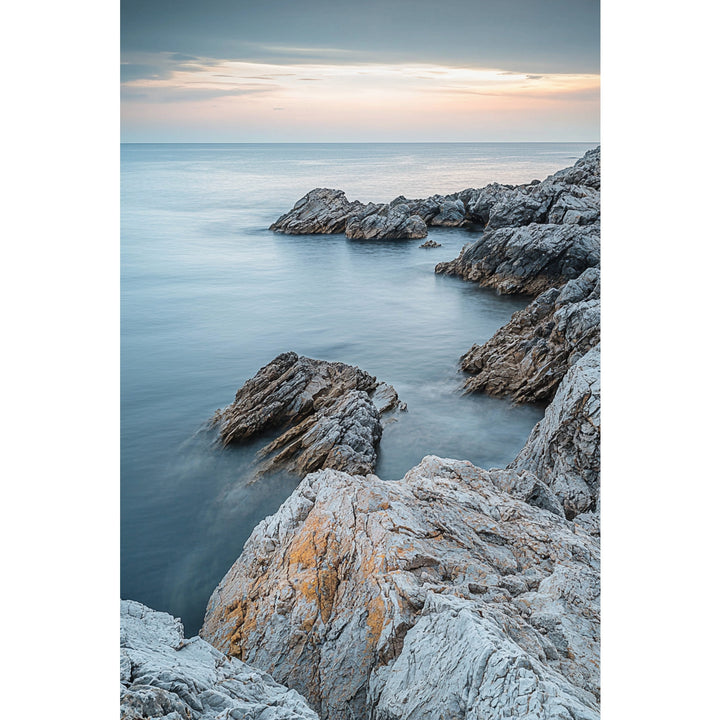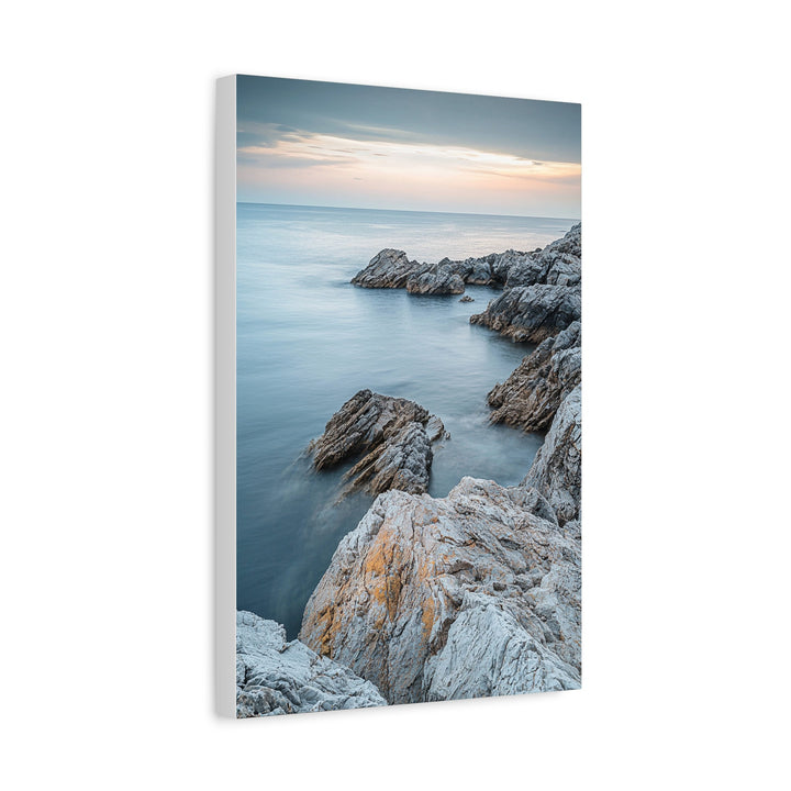 Stone Horizon captures the stillness of a rocky coastline at dusk — pale stone meeting soft blue water under a fading pastel sky. Gentle light washes over the surface, turning solidity into calm rhythm, form into reflection.