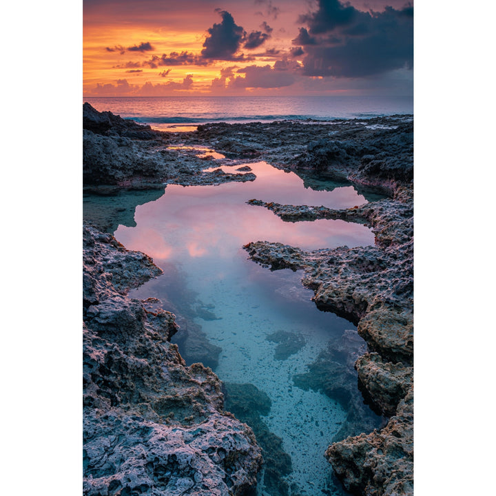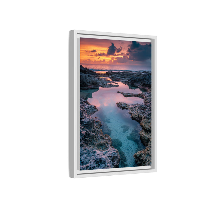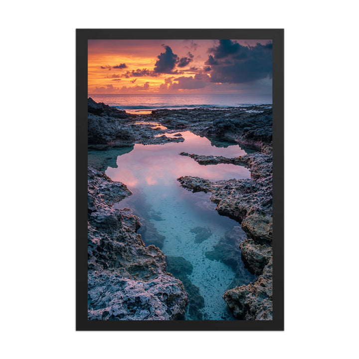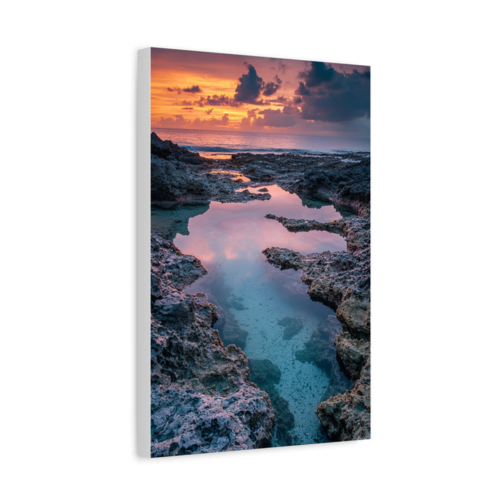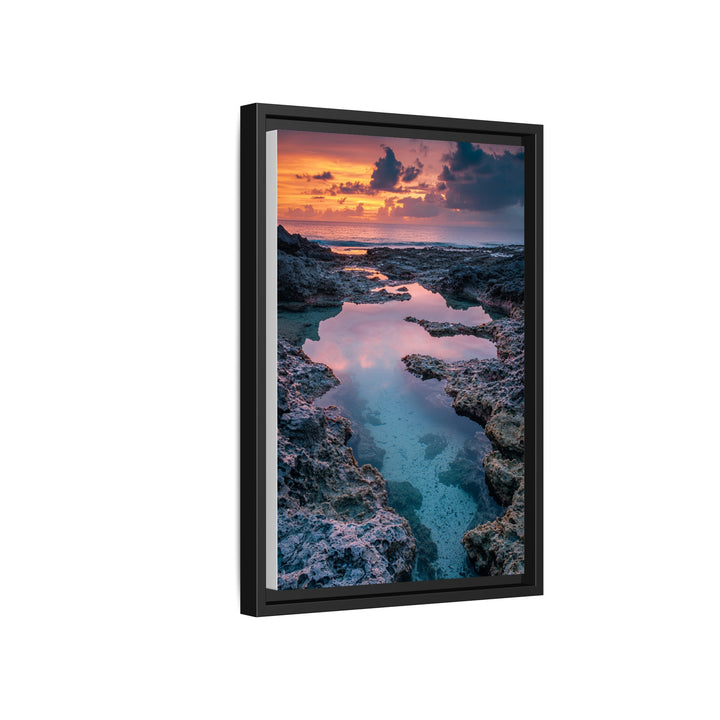 Tide of Light captures the soft glow of sunset over rocky tide pools — reflections of coral and gold floating on tranquil blue water. The balance of texture and stillness turns light into liquid form, evoking warmth, depth, and the quiet beauty of evening by the sea.