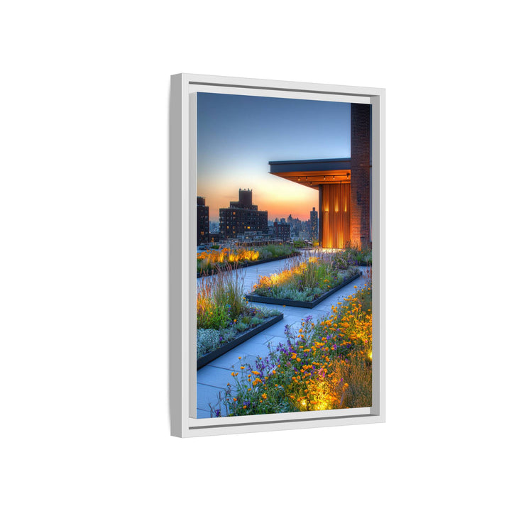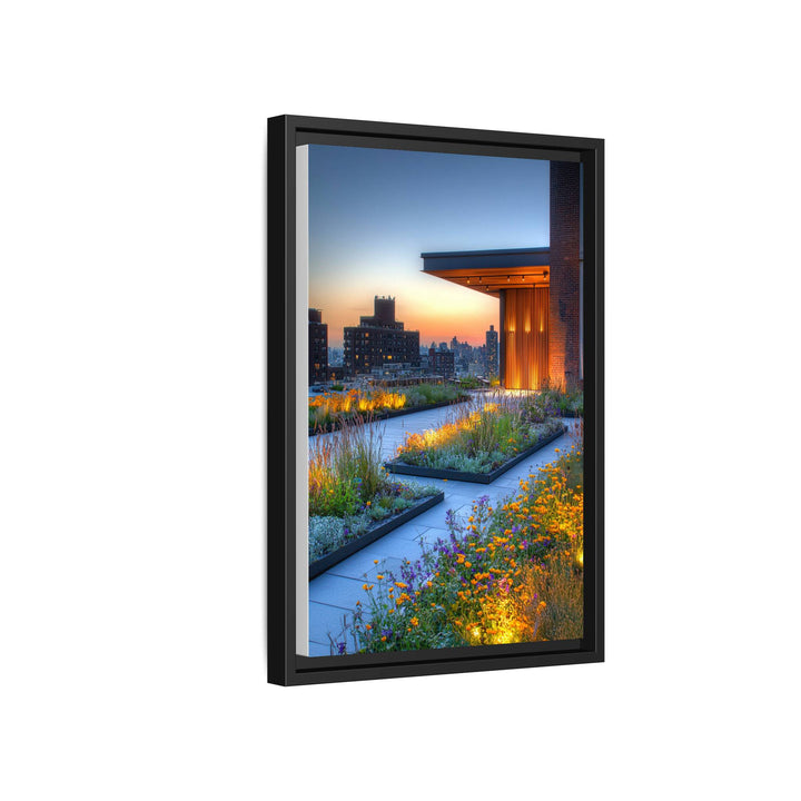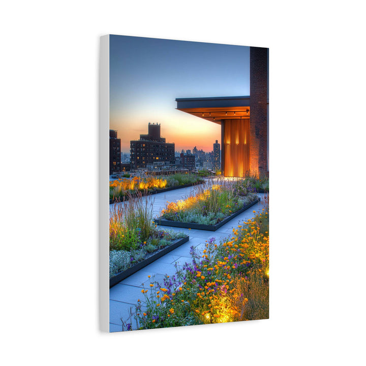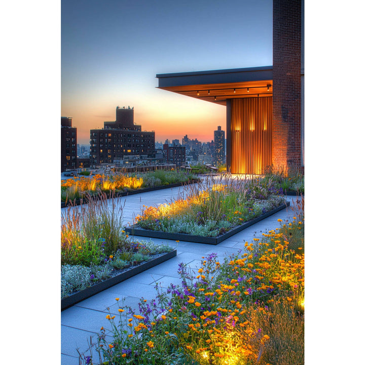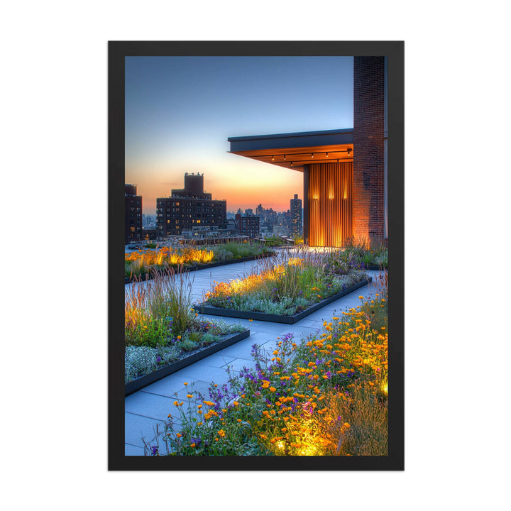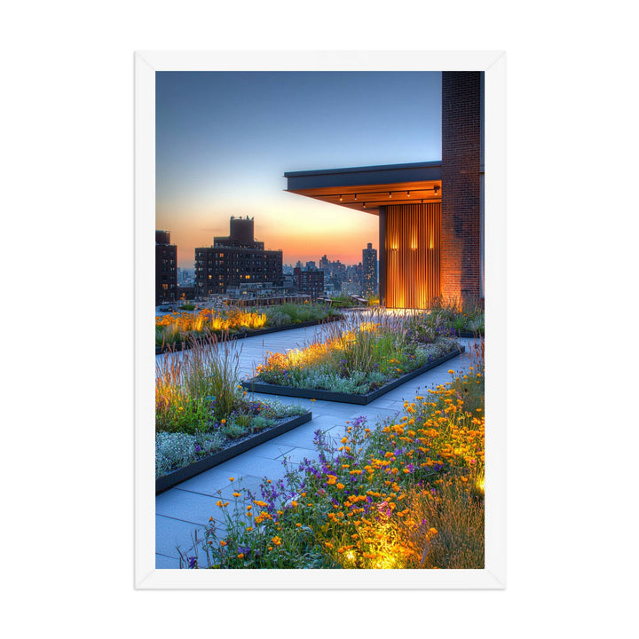 The Urban Bloom print captures a tranquil rooftop garden illuminated by the soft glow of evening lights. Muted city tones blend with warm hues of gold and violet, creating a perfect balance between urban structure and natural serenity. Its clean, modern composition evokes peace within motion — a quiet pause above the skyline.