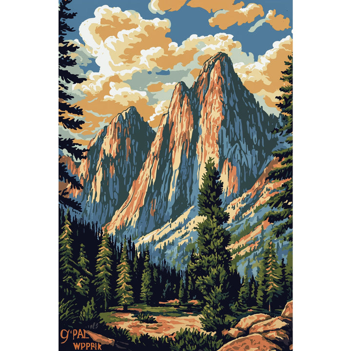 The Yosemite Majesty print captures the iconic granite cliffs and sweeping pine forests of Yosemite National Park, reimagined in the bold WPA style of America’s golden age of travel posters. Earthy tones and strong painterly strokes evoke the raw grandeur of the wilderness — timeless, enduring, and awe-inspiring.